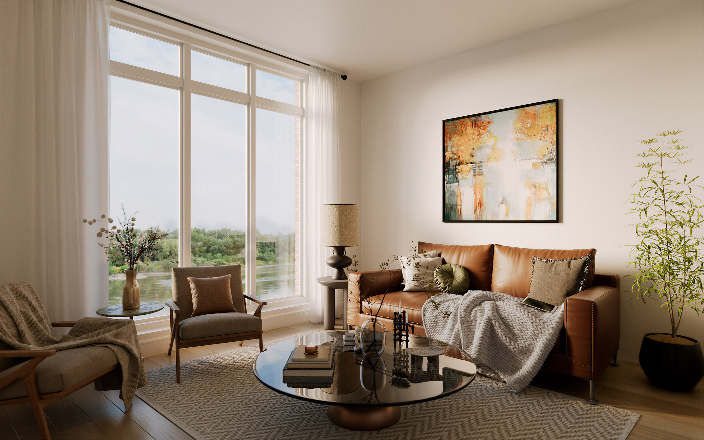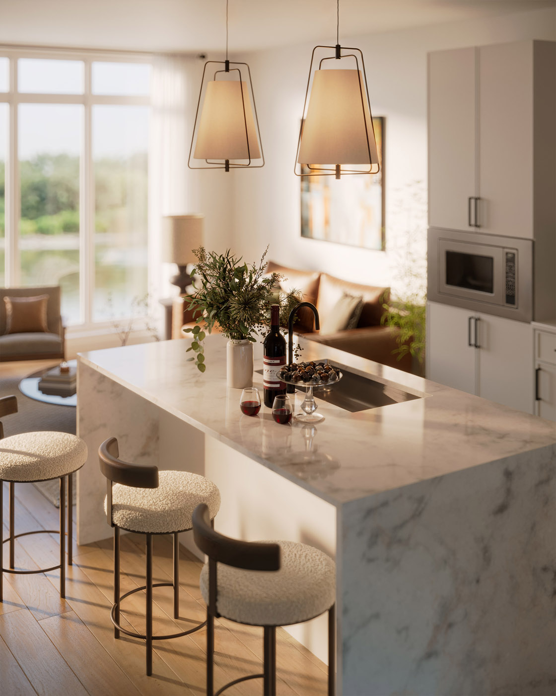 Multi-level river-facing residences with timeless finishes and custom detailing.